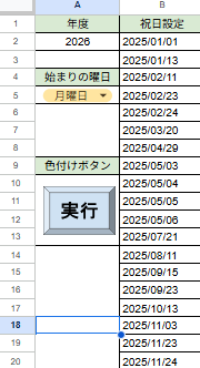 - 設定を入力する 「各種設定」シートで、年度や開始曜日、祝日・休みを入力します。